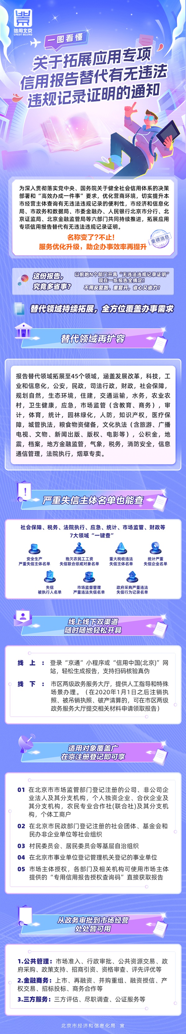 一图读懂《北京市经济和信息化局等六部门关于拓展应用专项信用报告替代有无违法违规记录证明的通知》